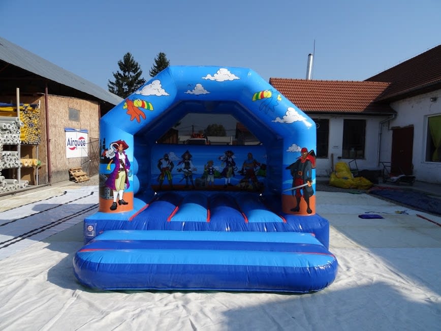 This bouncy castle is mainly bright blue in colour, with some fantastic pirate themed art work including male and female pirates of all ages and of course, a treasure chest full of gold coins. Why not send your child off on a pirate trip to track down the treasure with all their friends while having a bouncing good time – which no amount of gold coins could ever match?